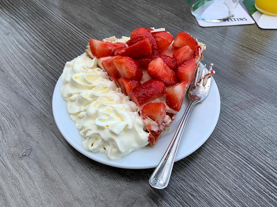 Das Wetter war super, am Himmel die Sonne und ein paar Wolken. Trotzdem war ich dann froh, als wir die Fähre erreichten. Nachdem wir rübergesetzt hatten, suchten wir ein Lokal auf, um uns ein wenig zu stärken. Wir fanden dann auch eins – direkt am Wasser. Der Erdbeerkuchen war übrigens richtig lecker :).